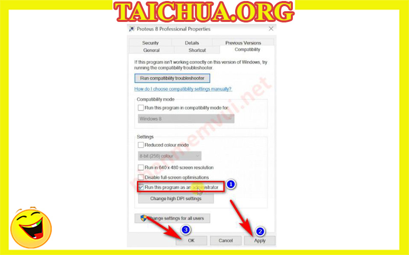 Tick vào ô Run this program… > Apply > OK.