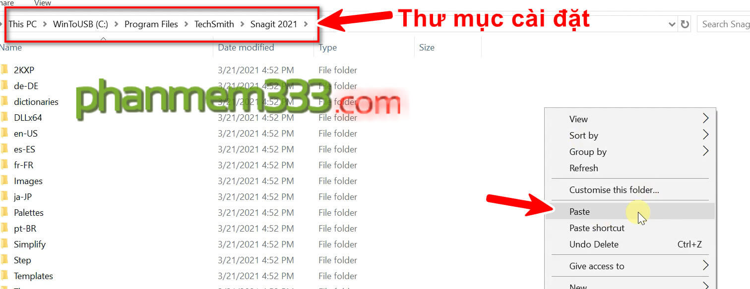 Thư mục cài đặt phần mềm Snagit 2025 nằm ở ổ C, có đường dẫn như bên dưới. Paste 2 file đã copy ở trên vào đây.