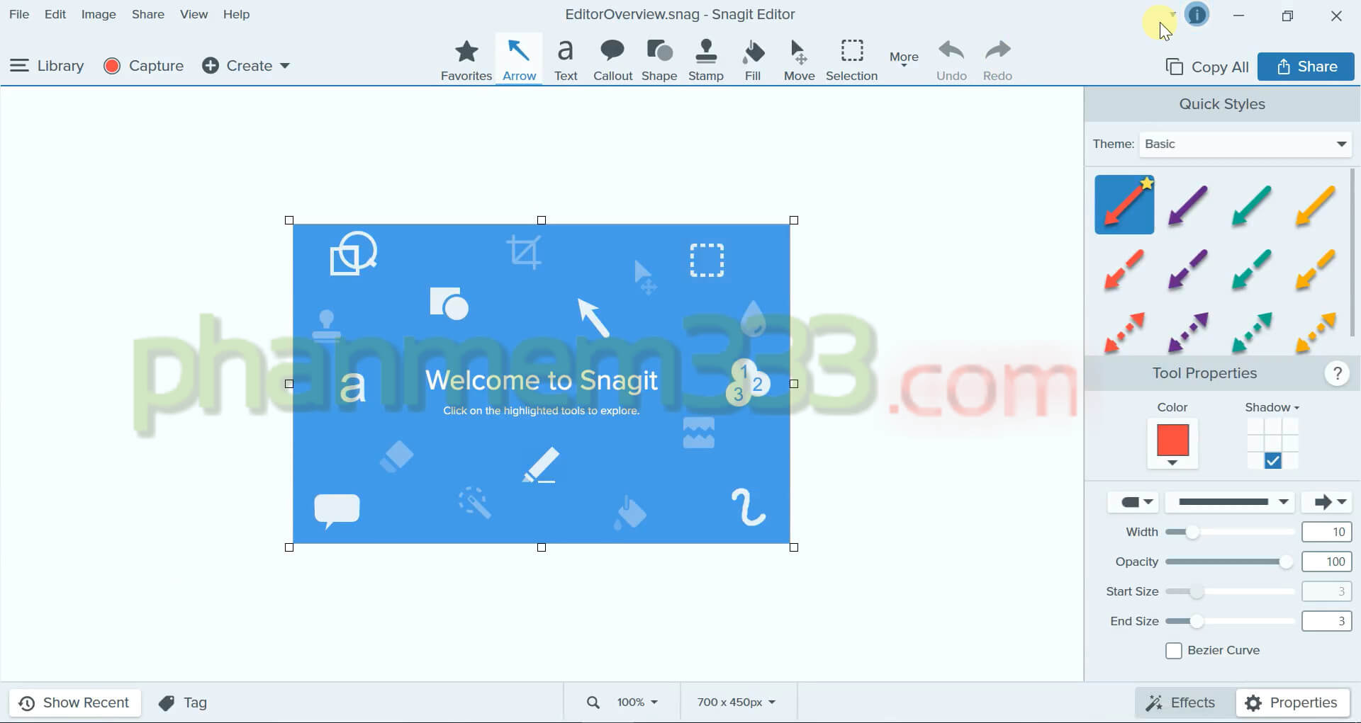 Sau khi chụp hoặc quay xong, bạn có thể sử dụng trình biên tập tích hợp của Snagit để thêm các thành phần như: