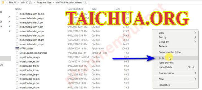 Bước 14: Tiếp tục vào thư mục cài đặt của phần mềm có đường dẫn: C:\Program Files\MiniTool Partition Wizard 12 và nhấp chuột phải vào vùng trắng rồi chọn Paste để sao chép 2 file đã copy ở trên vào thư mục này. (hoặc có thể nhấn Ctrl + V để Paste)